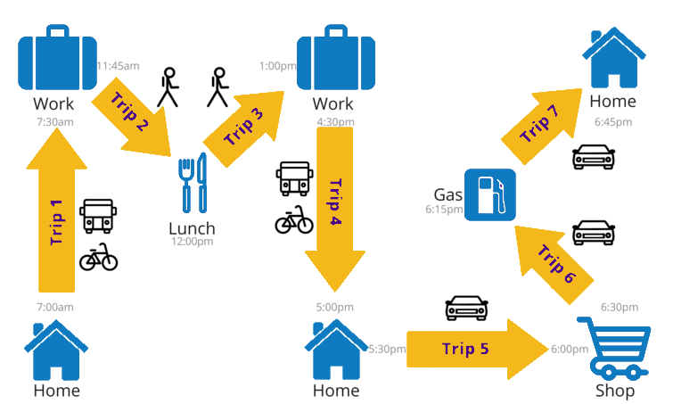 A trip may include more than one mode of travel, such as car and transit.- It is important to report all trips, even for a short distance, on foot for instance.
